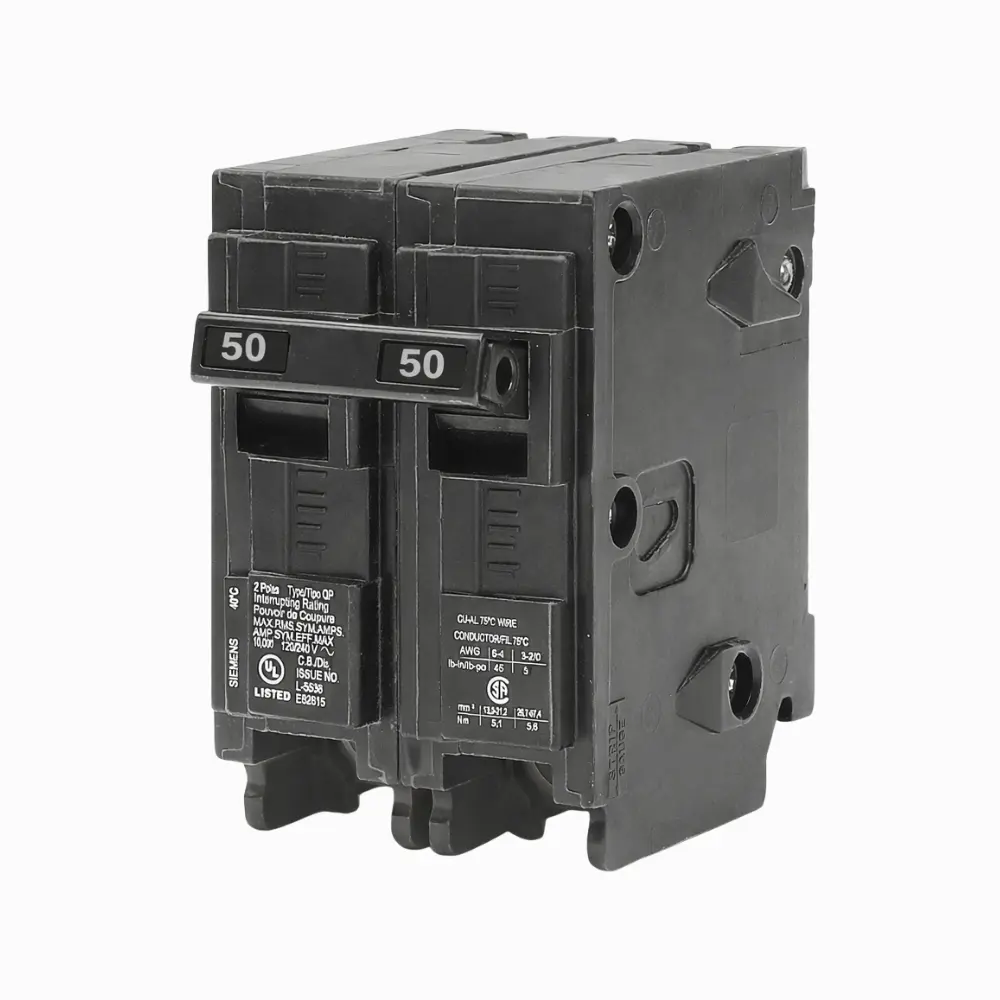 El breaker 50A 2 polos Siemens Q250 es ideal para aplicaciones a 120/240V como cocinas eléctricas, calentadores, aires acondicionados y equipos de alto consumo en Costa Rica. Su diseño enchufable permite una instalación rápida en centros de carga Siemens.