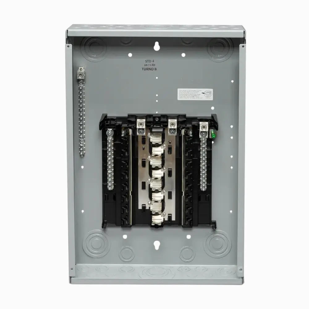 Opera a 120/240V monofásico, cuenta con barras de aluminio, capacidad de interrupción de 100 kA y envolvente NEMA 1 para uso interior, garantizando seguridad y cumplimiento de normativas eléctricas.